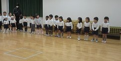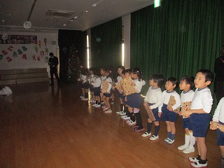 お弁当の後、3クラスで遊戯室に集まり歌を歌っていると、突然すずの音が聞こえてきました。子供達が「え!」と驚いていると、なんとサンタクロースがやってきたのです。子供達は大興奮していました。どうやら、今日午前中の参観日で歌や合奏を楽しんでいた子供達の音楽が、サンタさんのもとまで届いたようでした。