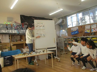 今回のビオトープ研修は、鳥についてのお話でした。鳥は、暖かい場所を求めて移動することや北極から南極まで遠い距離を飛んでいること、伊丹幼稚園にも飛んでくることも教えていただきました。