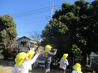 すると、鳥が次々とやってきました。「あの木の上に止まっているよ」「下から見えるかもしれない」と、鳥の止まっているところを見ることができるように、木の下から見上げたり、築山に登って見たりしていました。幼稚園にやってきた鳥も子供達のバードコールに応えてくれているようでした。しばらくすると、鳥を狙う鷹もやってきて、子供達は大喜びでした。
