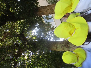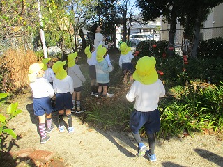 佐藤先生から「園庭で鳴らすと、鳥が仲間だと思ってやってくることがあるよ」と言うことを聞いて、園庭で鳥を呼んでみました。