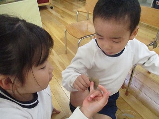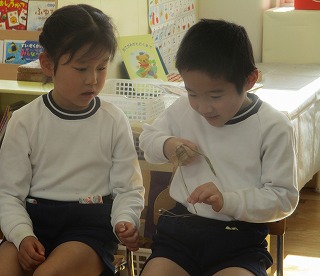寒くなると、ふわふわの家を自分で作って暮らしている虫や、枯れ葉にくっついたり、葉っぱを巻き付けて冬越しをする虫を実際に見せていただきました。「触ってもいい?」と先生に確かめたり、「顔が見えるよ」と教えてもらうと、覗き込んでみたりしてとてもその面白さや不思議さに興味をもっていました。