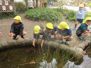 園庭ではビオトープの水の冷たさを感じたり、新芽やロゼットを探したりしました。