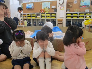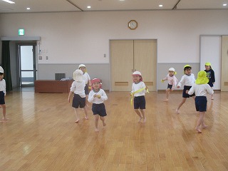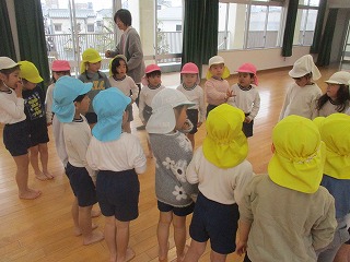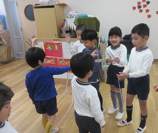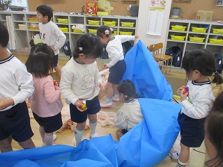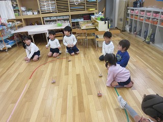 当日は生憎の雨で、『砂場で宝さがし(保育室バージョン)』、『こまあそび』、『フクロウとねずみのしっぽとり』の3つの遊びを3クラスの友達がまじりあいながら楽しみました。