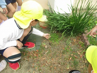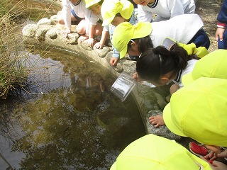 ビオトープで見つけたヤゴを佐藤先生に見せてもらった後、みんなでビオトープに戻しました。「トンボになったら小学校まで飛んできてくれるかな?」と再会に思いを寄せていました。