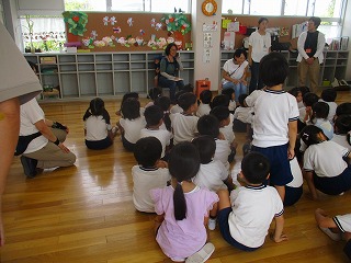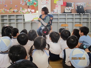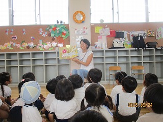 にこにこ絵本タイム 更新日:2025年09月25日 2学期初めてのにこにこ絵本タイムでした。 おべんとうばこのうたの手遊びをして、絵本を2冊読んでいただきました。 絵本サークルの保護者のみなさんのあたたかいまなざしと声色に、うっとり聞き入っていました。