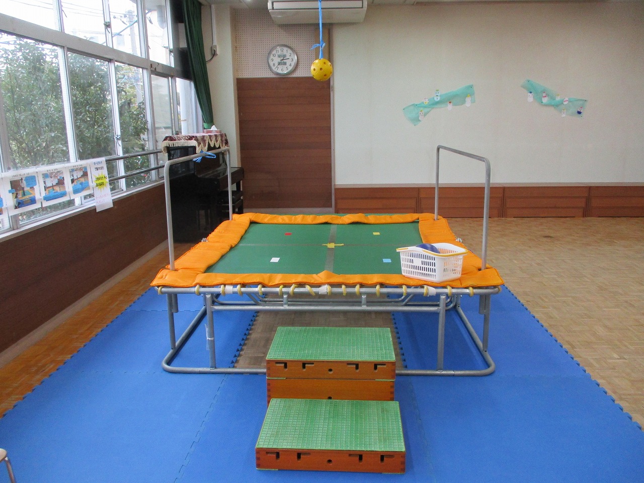 トランポリンでは、3歳児の子どもたちはまずは跳ぶことを十分に楽しめるように、そして、様子に応じて少し難しいことにも挑戦できるよう頭上の鈴ボールにタッチしたり、4分割に色分けしている色をお家の人が伝えてその色のところで跳んだりするという遊びもできるよう設定しました。4歳児の子どもたちは、個々の様子に応じて、跳びながらお家の人の投げたボールをキャッチする、跳びながらお家の人にボールを投げるということにも挑戦できるよう設定しました。