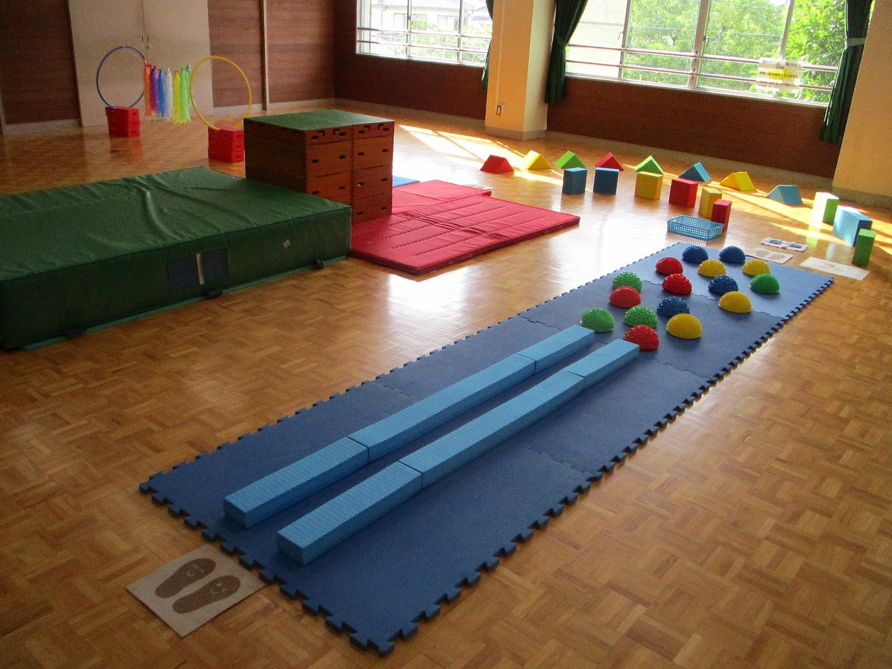 4歳児5歳児対象のにじいろ広場を行いました。今回の広場のねらいや前半の遊びは右記の通りです。楽しみながら、四肢を大きく動かしたり、左右のバランスをとったりして遊ぶことができるよう遊びを設定しました。