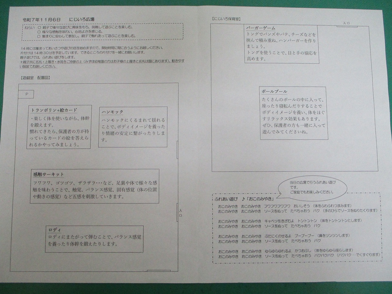 3歳児、4歳児対象のにじいろ広場を行いました。今回の広場のねらいや前半の遊びは右記の通りです。