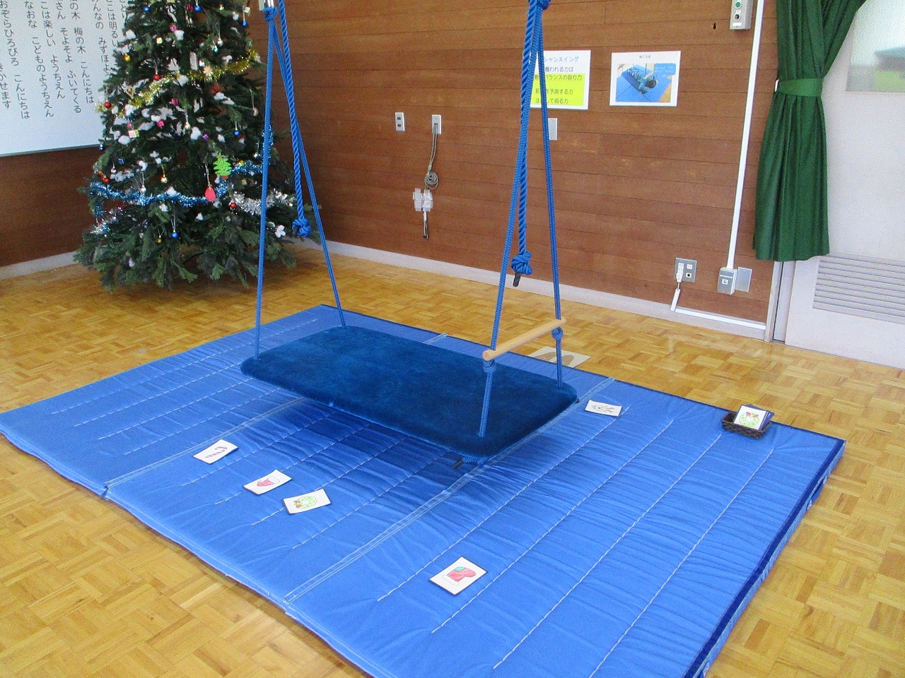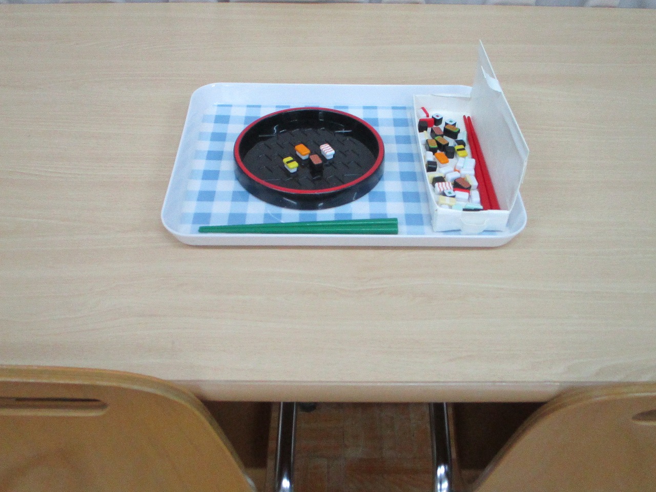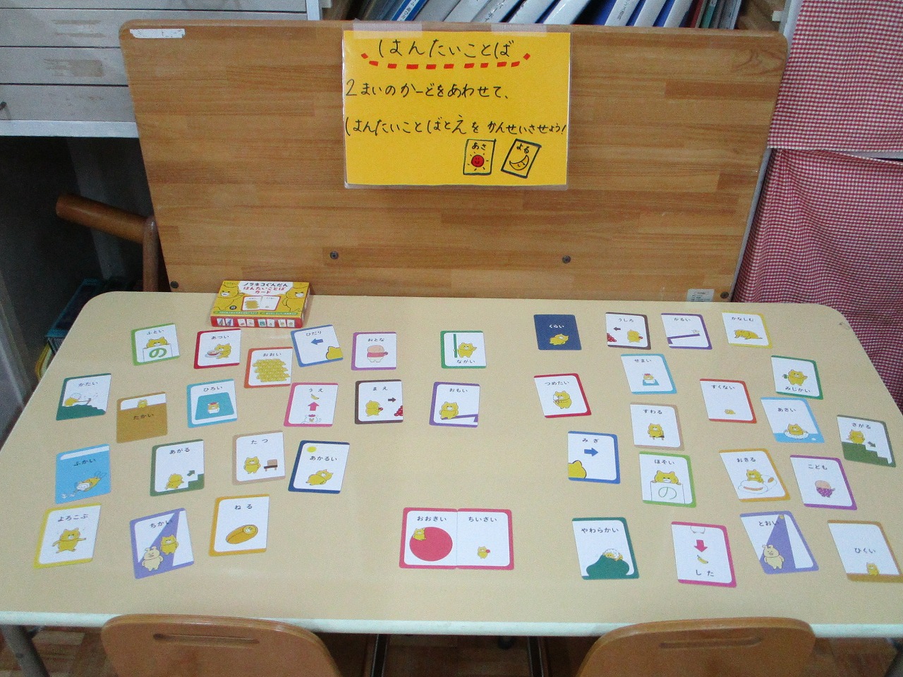 にじいろの保育室には、お箸遊びや反対ことばカードなどの静的な遊びにも取り組めるよう設定しました。