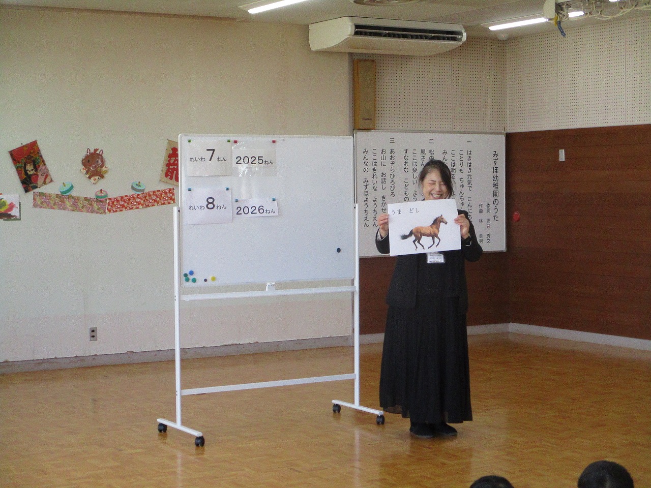 始業式では、園長先生から、風をきって速く走る賢い動物である馬のように少し難しいことにも挑戦してやりきることができるようにというお話を聞きました。また、保健の先生から、風邪のウイルスから体を守るために大切な3つのお約束について話を聞きました。