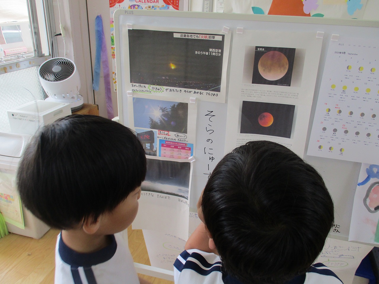 1学期から宇宙に興味、関心を広げている年長児たち。月食を見た日はキラキラした瞳で話してくれました。友だちもびっくり!