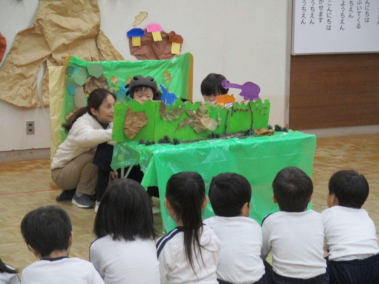 11月からそら組の子供たちと、参観日で自分たちの作るお話を見てもらおうと楽しみに準備を進めてきました。4つのグループに分かれてお話作りをし、ペープサートを作ったり背景を作ったりしてきました。