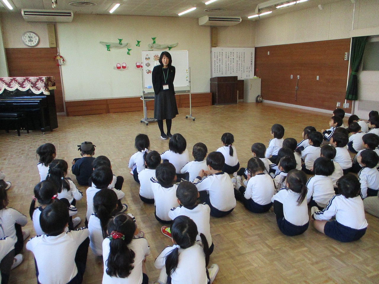 その後、2学期の終業式を行いました。園長先生のお話を聞きながら2学期を振り返り、自分たちの成長を感じたり、保健の話を聞いて冬休みを元気に過ごすために大切なことを皆で確認したりすることができました。楽しい冬休み、お正月を過ごし、また1月9日に元気な子ども達に会えることを楽しみにしています。