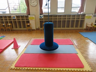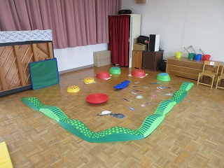 体の曲げ伸ばしをすることで自分の体の使い方がわかる遊び、揺れや体の傾きから 反射的にどう動くべきか遊びを通して体幹、バランス、自分の体の使い方がわかる経験できるように取り入れました。