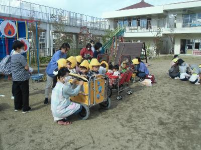 火災の避難訓練を行った後、5歳児が幼年消防クラブの活動に参加しました。