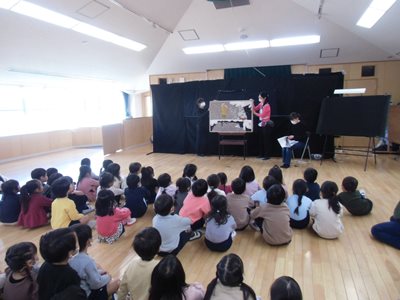 4・5歳児クラスは、人形劇「リンリンマミーズ」さんから、人形劇やブラックライトシアター、大型紙芝居を見せていただきました。