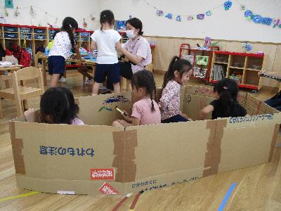 友達と一緒に共通の目的をもって一つの物を作ったりすることも楽しんでいます。その中で、自分の思いを友達に伝えたり、考えを出し合ったりなど人とのかかわり方の基礎になる部分を遊びを通して学んでいきます。