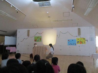 影絵でクイズをしました。少しずつ見えてくる影を見て大盛り上がりで答えていました。
