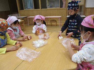 ピーラーの角度や力加減が難しそうにする子や、慣れた手つきで皮をどんどんむいていく子などそれぞれ自分なりにクッキングを楽しんでいました。