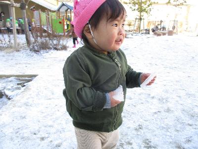 今年初めて雪が降った日。外は真っ白に。こんな日はめったにありません!早速雪を触りに戸外へ出ました。いつもと違う足の感触です。分厚い氷も張っていましたよ。手に持ってその冷たさを感じます。だんだん手がじんじんしてきたようで・・・この後は保育者に真っ赤になった両手を見せ、泣きながら冷たさを知らせていました。