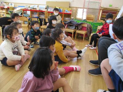 続けて保育者から「木は汚れた空気を吸って、きれいな空気を出してくれているんだよ」と、新たな知識を聞き、「へぇ~」と感嘆の声が上がりました。驚きです!更には、「そんな木がどんどん切られているんだよ」と。