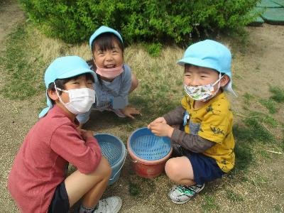 ダンゴムシやてんとう虫など園庭にいる生き物と出会うことを楽しんでいます。