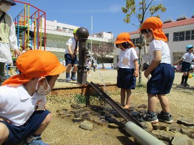 日差しが温かく過ごしやすい季節になってきました。いい天気の中、子どもたちも園庭でのびのびと遊んでいます。こども園での生活にも少しずつ慣れ、ポンプで水を流したり、砂場で山を作ったり、遊具で遊んだりと自分の好きな遊びを見つけて楽しんでいます。ダンゴムシを見つけた際には「見せて見せて!」と大喜びだった子ども達。春ならではの生き物に触れたり、水の冷たさを感じたり、日々新しい面白さに出会っているようです。