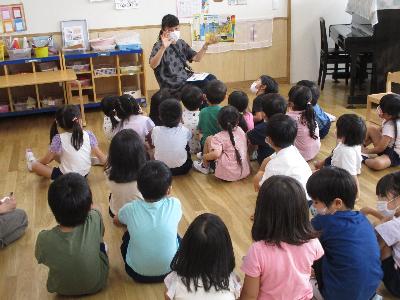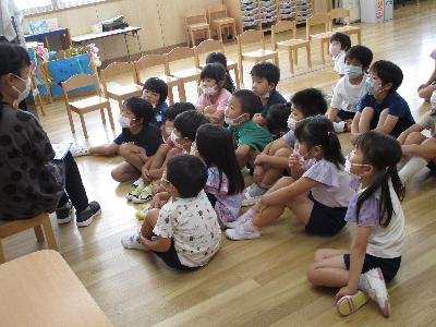 おにぎりはどこから来たのかな、という問いに、「お米は田んぼから」「しゃけは海から」「へぇー」「そうなんだ」と興味、関心を持ってクラスで会話をしていました。