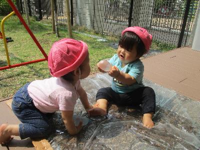 眩しい太陽の下の毎日は、心躍る体験でいっぱいです。水風船の感触に心が弾み、幼いながらも感じたことを伝えようとしています。思いを伝える相手、思いを共感してくれる相手の存在を心地よく感じながら遊んでいます。