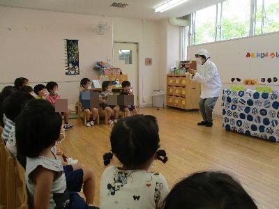 そら・うみ組 理科の先生に来ていただき、サイエンスマッジクを見ました。袋をガスコンロで温めると熱気球になって、それが高く浮かんだので「すごい!浮かんでる!」ととても驚いていました。みんなキラキラとした目をして夢中になってみていました。