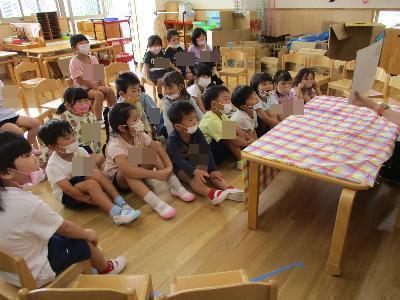 ひかり組 「おおきくおおきくおおきくなあれ」の紙芝居を見ました。言葉に合わせて、『おおきくなあれ!!』と元気いっぱい言っていましたよ。
