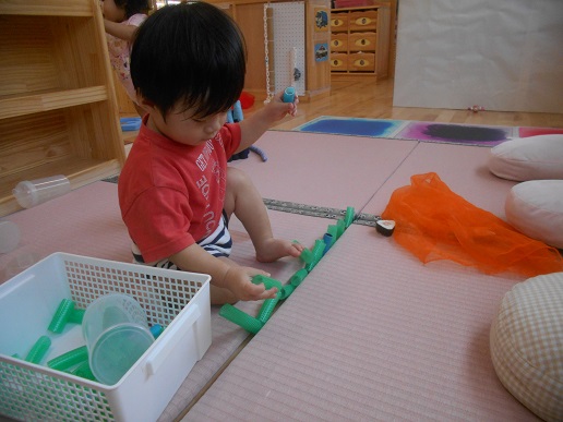穴の大きさや入れる玩具の大きさ柔らかなど、一人一人の発達に合わせて、指先でつまむ、手でつかむ、引っ張るなどの手先を使う玩具を準備しています。
