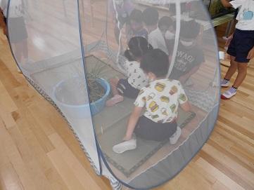より身近に虫を見たり触れたりしてほしいと、保育室に蚊帳を置きました。