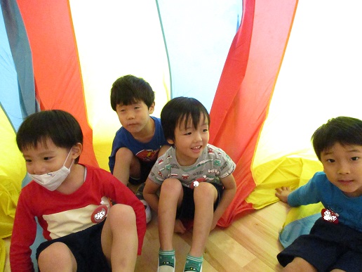 先日雨が降った日に、4歳児クラスの子ども達とパラバルーンで体を動かし、気持ちを発散させて遊びました。