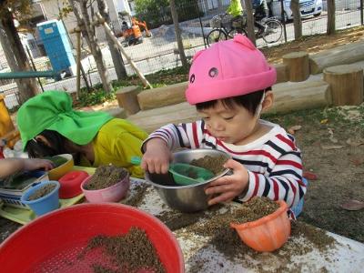 0歳児クラスの子どもが、砂場の玩具の中から自分が使いたいものを選び砂をすくってカップに入れています。