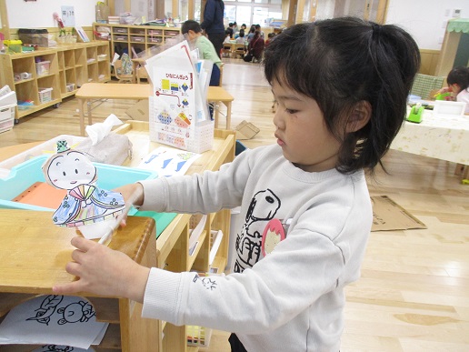 「これがわたしのおひなさま。」と完成したおひなさまを友達や保育者に見せていました。
