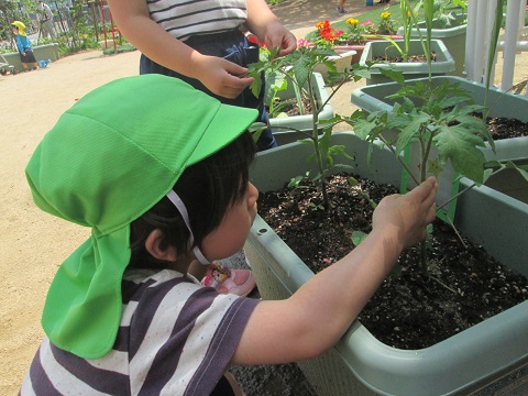 苗を植えた次の日から、園庭に出る時には「トマトとキュウリ大きくなってるかな?」と楽しみにしています。