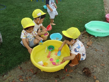 みかん組の子ども達が遊ぶことを願って、保育者は水遊び道具を用意しておきました。