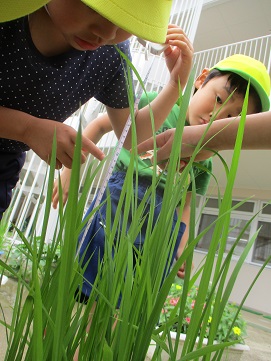 5歳児クラスの子ども達が育てているバケツ稲の中ぼしをしました。