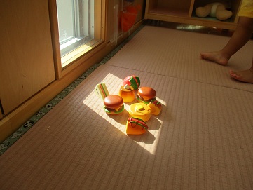 ままごとの食べ物をせっせと運んでいたので何をしているのかなと思って見ていたら、小窓から室内に差し込む光に気づいて、そこに食べ物を並べていたのです。