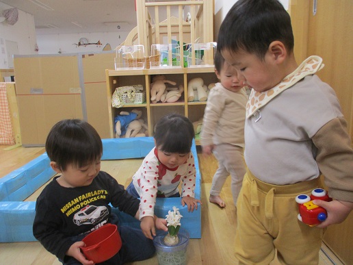 0歳児クラスの保育室前の廊下と保育室のヒヤシンスが咲きました。