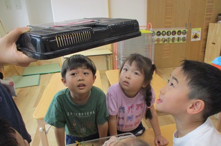 そのことを発見した子が大きな声で「さなぎになってる。」と言うと、子ども達が集まって飼育ケースの中を覗き込んでいます。