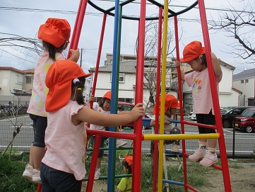 登降棒や八角ジムで遊ぶことが楽しい2歳児クラス(みかん組)の子ども達です。