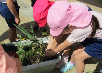 子ども達は土からのぞく大きく生長したたまねぎを見て、「タマネギ大きい。」「どうやってぬく?」と張り切っていました。