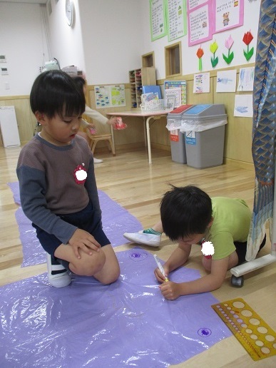 園庭に泳ぐこいのぼりを見て、5歳児クラスの子ども達は保育室で絵を描いたり素材を組み合わせて製作をしたりして楽しんでいます。