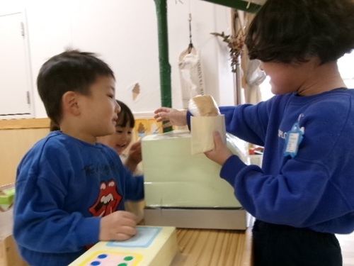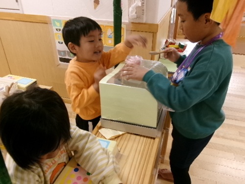 5歳児が作ってもってきたお金を渡すと、乳児の子どもたちは喜んでケーキ屋やジュースなどを売っていました。