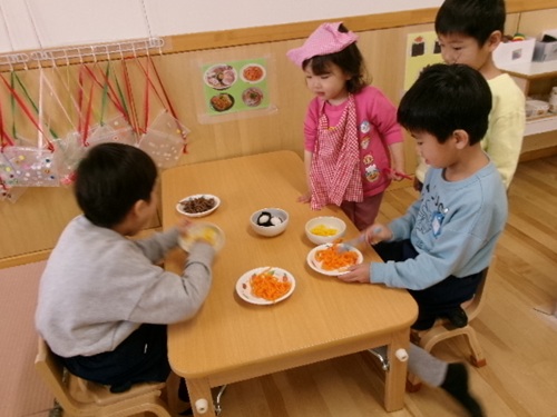 5歳児は乳児の子どもたちにどのように声をかければいいのか分からずそっと声をかけたり、話すタイミングを伺ったりしながら思うように声をかけられずにいました。乳児の子どもたちが絵本を読んで欲しくてもってきたり、ままごとコーナーで作ったご飯をもってきたりしたことで、少しずつ遊び始めました。