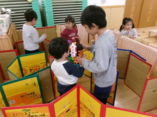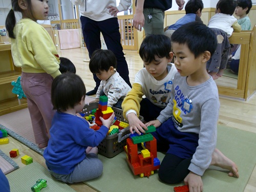 乳児の子どもたちは5歳児が作ったブロックや迷路を真似たり、一緒に作ったりして遊んでいました。互いに相手のことを思い、優しくて暖かい時間になっていました。
