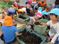 「ふかふかの土がいいんだって!」と土づくりをしながら感触を確かめたり、野菜苗を一つ一つ見比べながら、葉の形や匂いなどの気づいたことを周りの子とつぶやきあっていました。