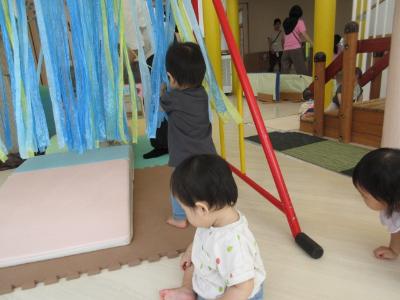 0歳児クラスの子ども達は、はいはいをしたりつかまり立ちをしたりするなど動きが活発になってきました。